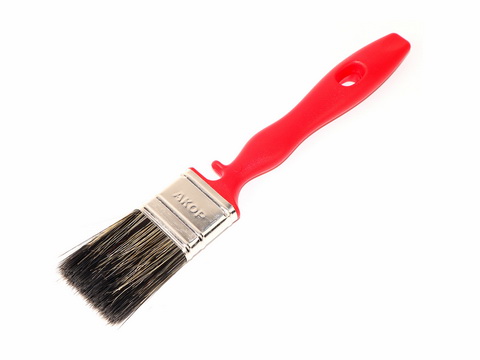 Смешанный состав щетины, красная пластиковая ручка с возможностью крепления на емкости с краской.