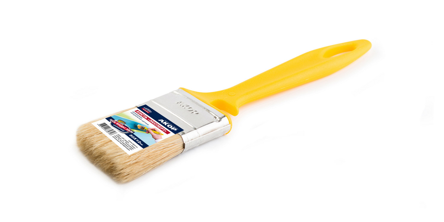 Флейцевые кисти «Эксперт», толщина 10-12 мм., светлая натуральная щетина, желтая пластиковая ручка с возможностью крепления на емкости с краской.